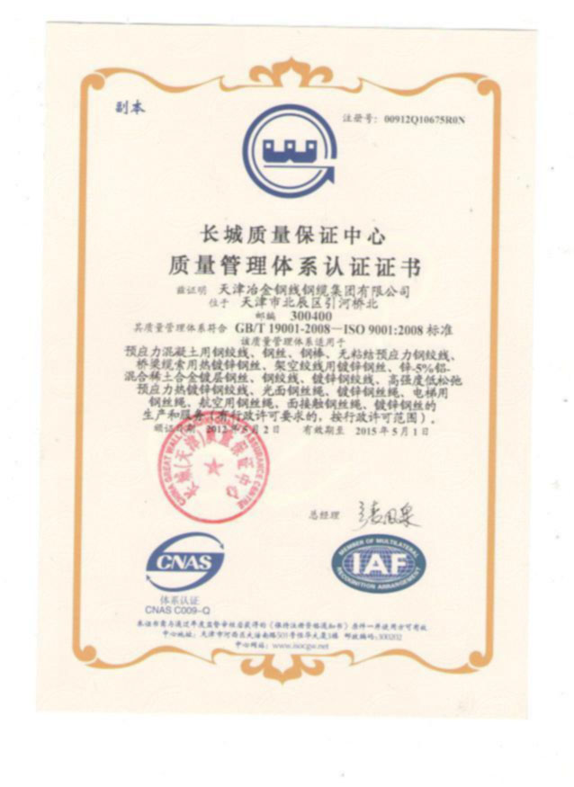 • 南通鋼絲繩公司預應力混凝土用鋼筋認證證書